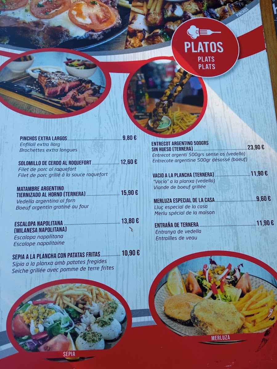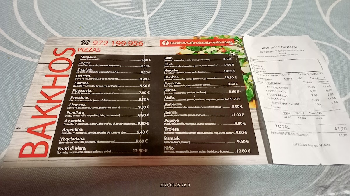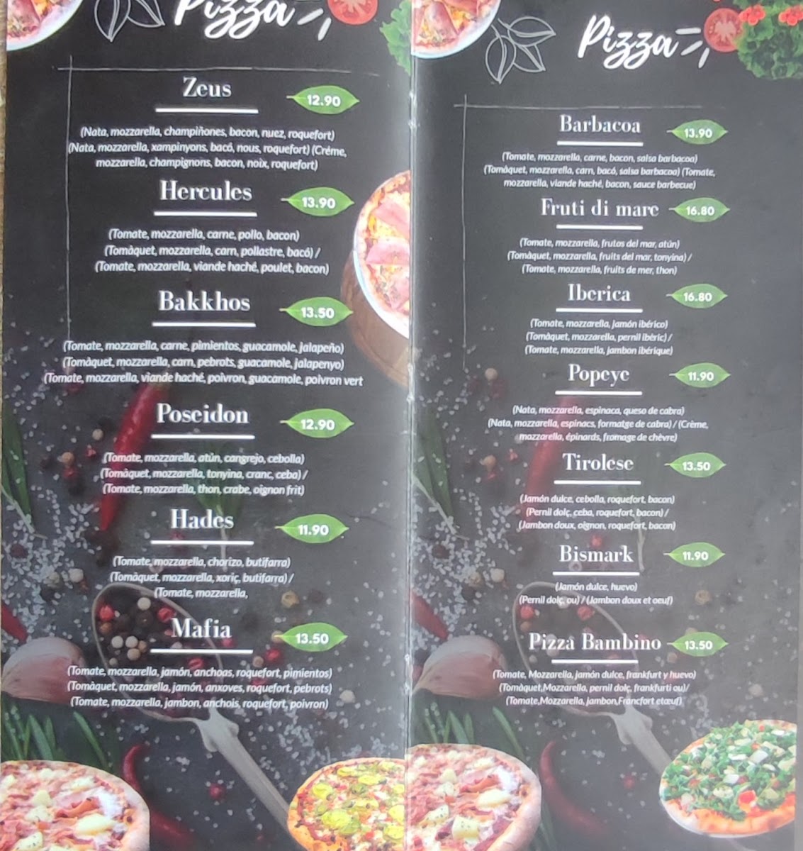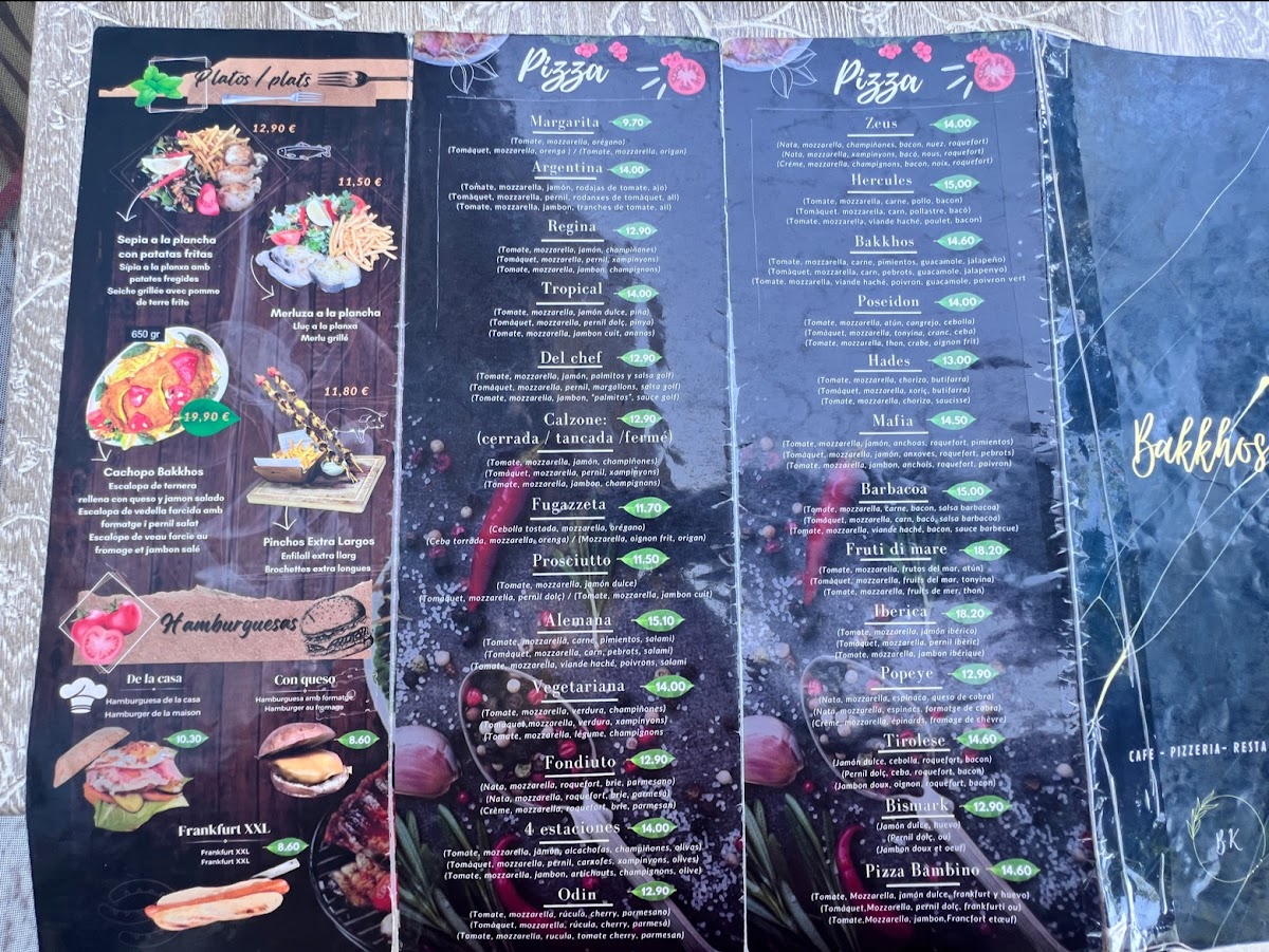 Bakkhos Café-Pizzeria-restaurante offers a menu that blends casual dining with comforting, familiar flavors, making it a great spot for relaxed meals throughout the day. The selection includes a mix of hearty pizzas, traditional Spanish tapas, and Argentine-inspired dishes, all served in a welcoming and lively atmosphere.